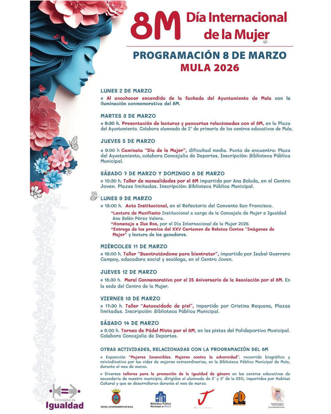 El Ayuntamiento de Mula ha presentado hoy la programación con motivo del 8 de marzo, Día Internacional de la Mujer, impulsada por la concejalía de Mujer e Igualdad con el objetivo de reforzar la sensibilización social, la participación ciudadana y el trabajo transversal en materia de igualdad de género.