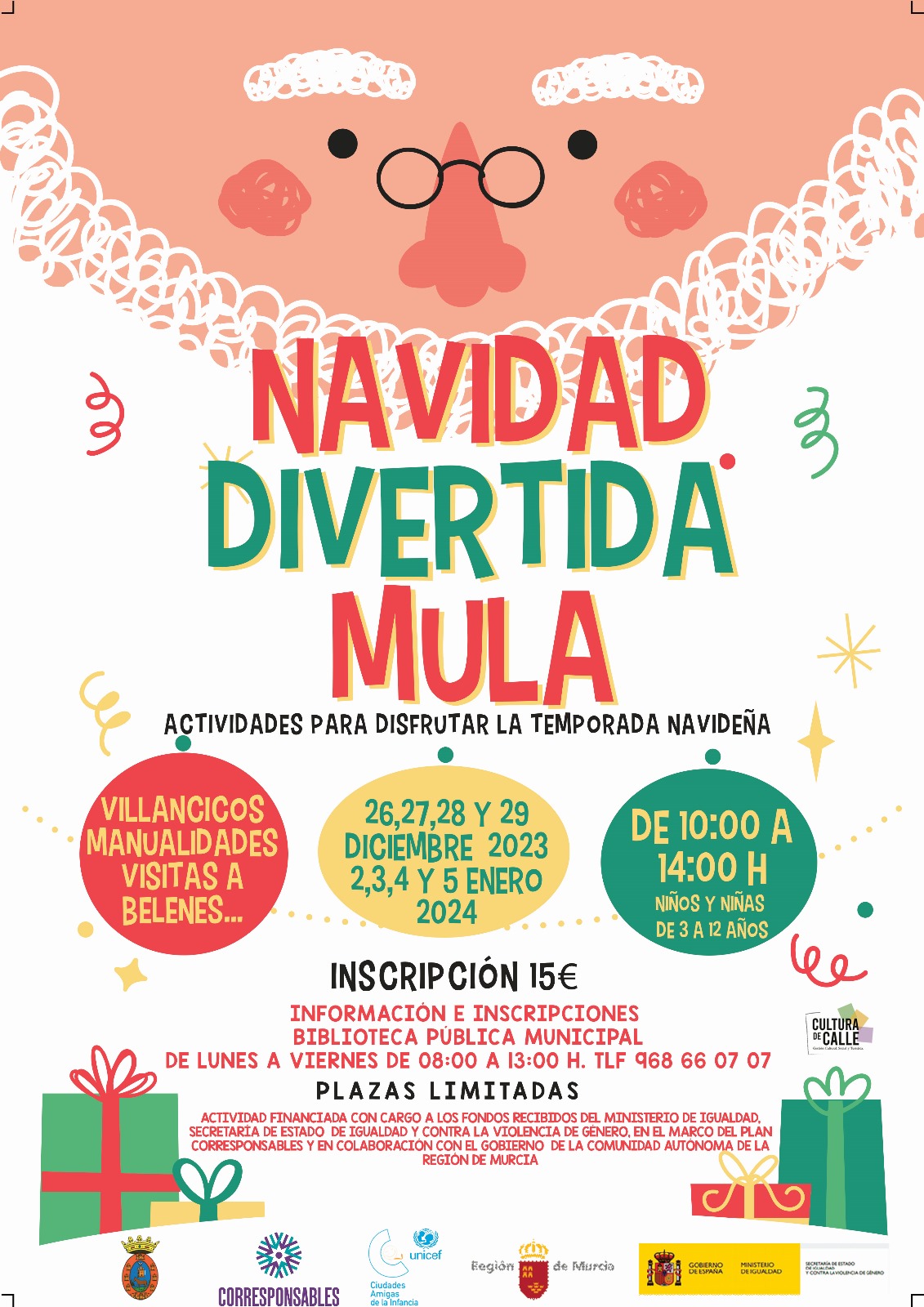 La Concejalía de Igualdad del Ayuntamiento de Mula, a través del Plan Corresponsables, y en colaboración con Cultura de Calle Gestión Cultural, pone en marcha la Escuela de Navidad Divertida, una iniciativa para que los niños y niñas del municipio disfruten de su tiempo libre durante las vacaciones navideñas a la vez que se promueve la conciliación familiar.