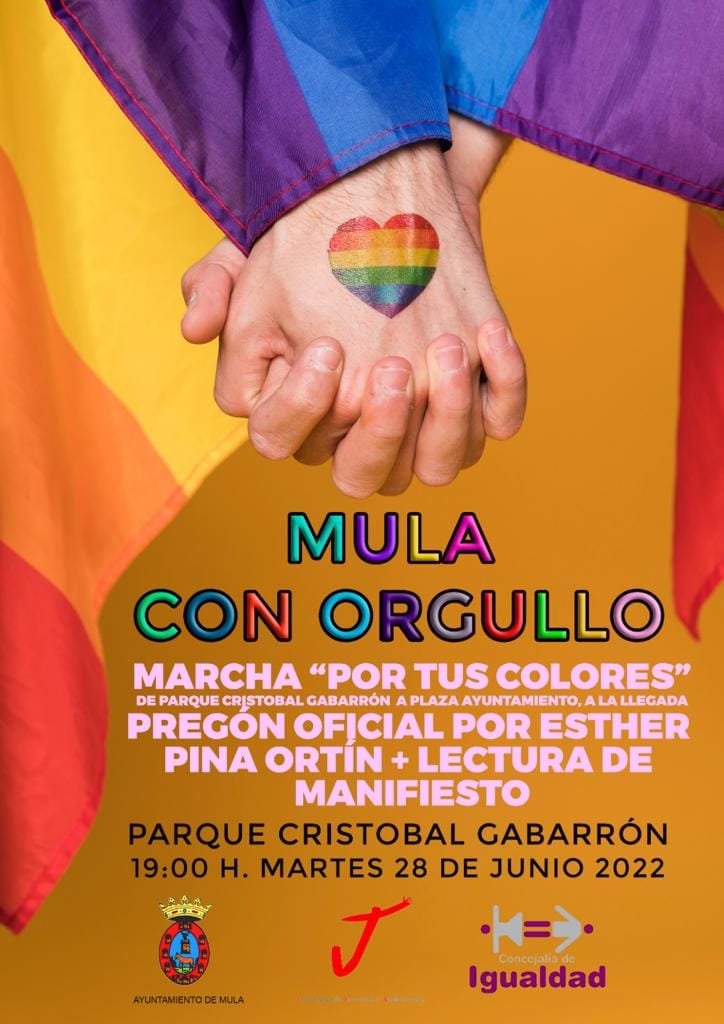 El martes día 28, con motivo del Día del Orgullo, con salida desde el Parque Cristóbal Gabarrón a las 19.00 horas, tendrá lugar la Marcha ‘Por tus colores’ que recorrerá las principales calles de la localidad hasta llegar a la Plaza del Ayuntamiento donde se leerá el primer Pregón por el Día del Orgullo a cargo de la muleña Esther Pina Ortín tras el que se procederá a la lectura del Manifiesto por el Día del Orgullo 2022.
