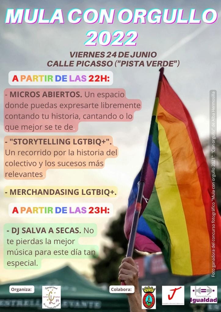 Así, para ese día, los jóvenes muleños con la colaboración del Ayuntamiento de Mula han organizado una propuesta de Micros Abiertos donde cualquier persona pueda expresarle libremente contando su historia, cantando o lo que desee mostrar a los asistentes. También tendrá lugar un ‘Storytelling LGTBI+’, un recorrido por la historia del colectivo y los sucesos más relevantes. En el mismo espacio habrá merchandising LGTBI+. A partir de las 23.00 horas habrá música en directo con DJ Salva a Secas.