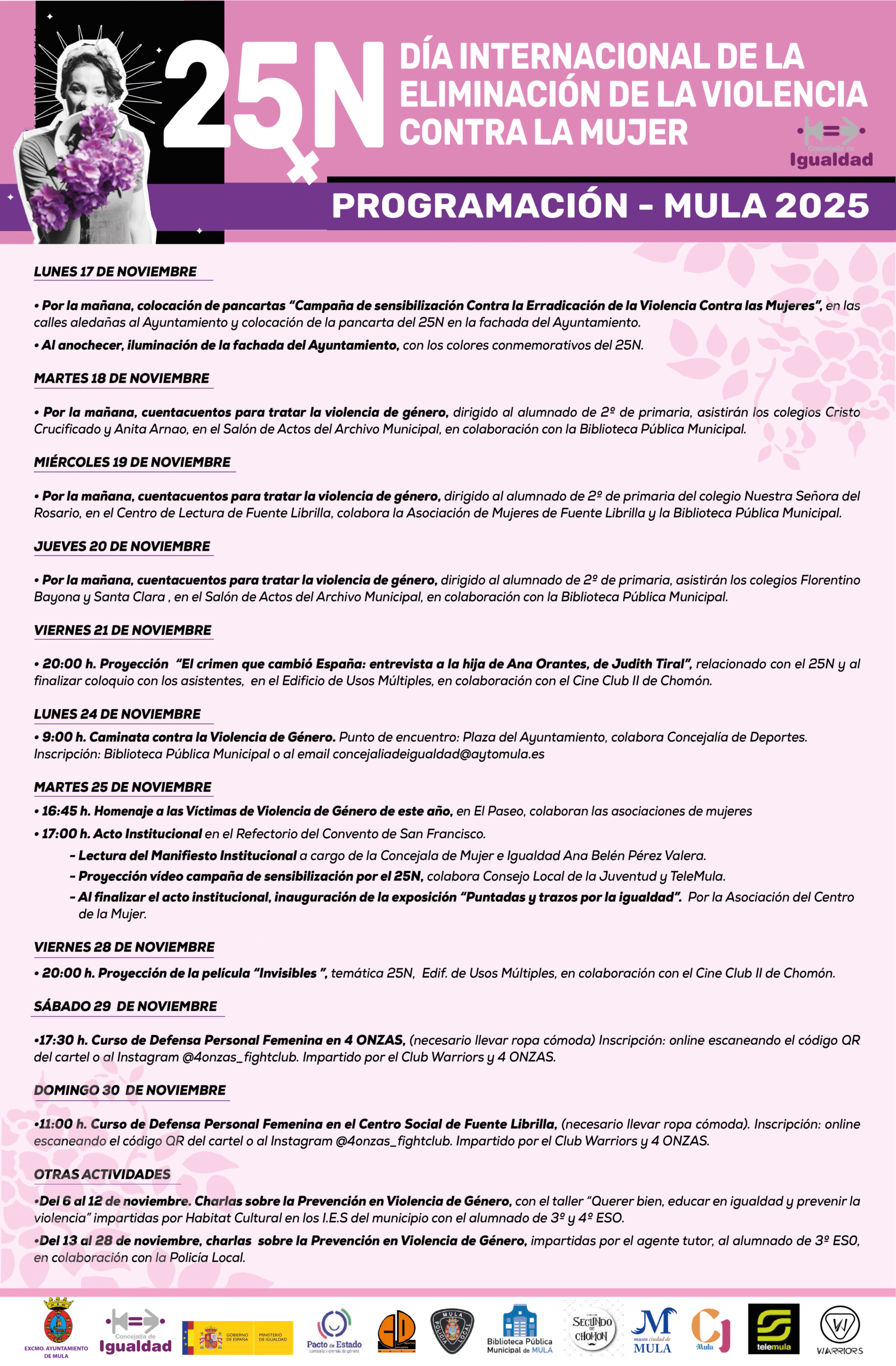 La programación, que se desarrollará desde el 6 hasta el 30 de noviembre, incluye actividades dirigidas a toda la población: talleres en centros educativos, cuentacuentos infantiles, cinefórum, marchas solidarias, actos institucionales y talleres de defensa personal femenina.
