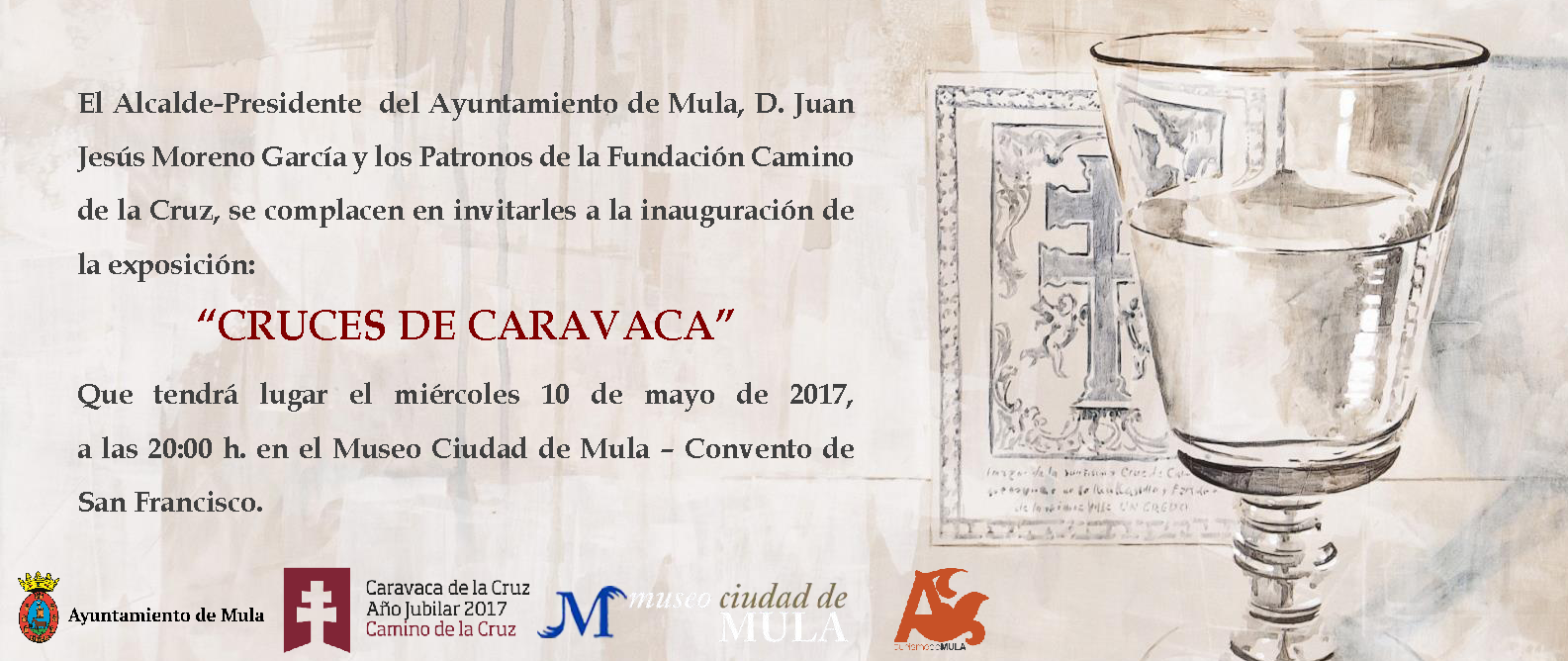 Por ello, el próximo miércoles 10 de mayo a las 20:00 h. en el Museo de la Ciudad – Convento de San Franscisco, va a ser inaugurada la exposición «Cruces de Caravaca», una muestra en la que se ofrecen 20 interpretaciones de la Cruz de Caravaca por 20 artistas contemporáneos de la Región de Murcia, la cual va a poder visitada hasta el 12 de junio de 2017.
