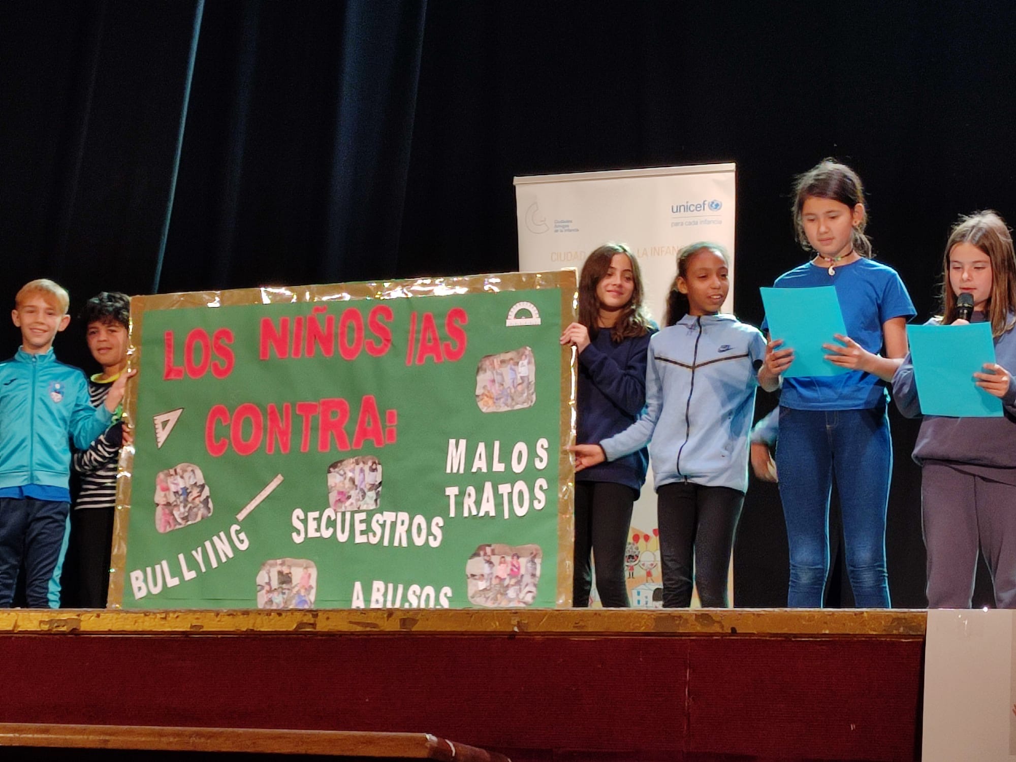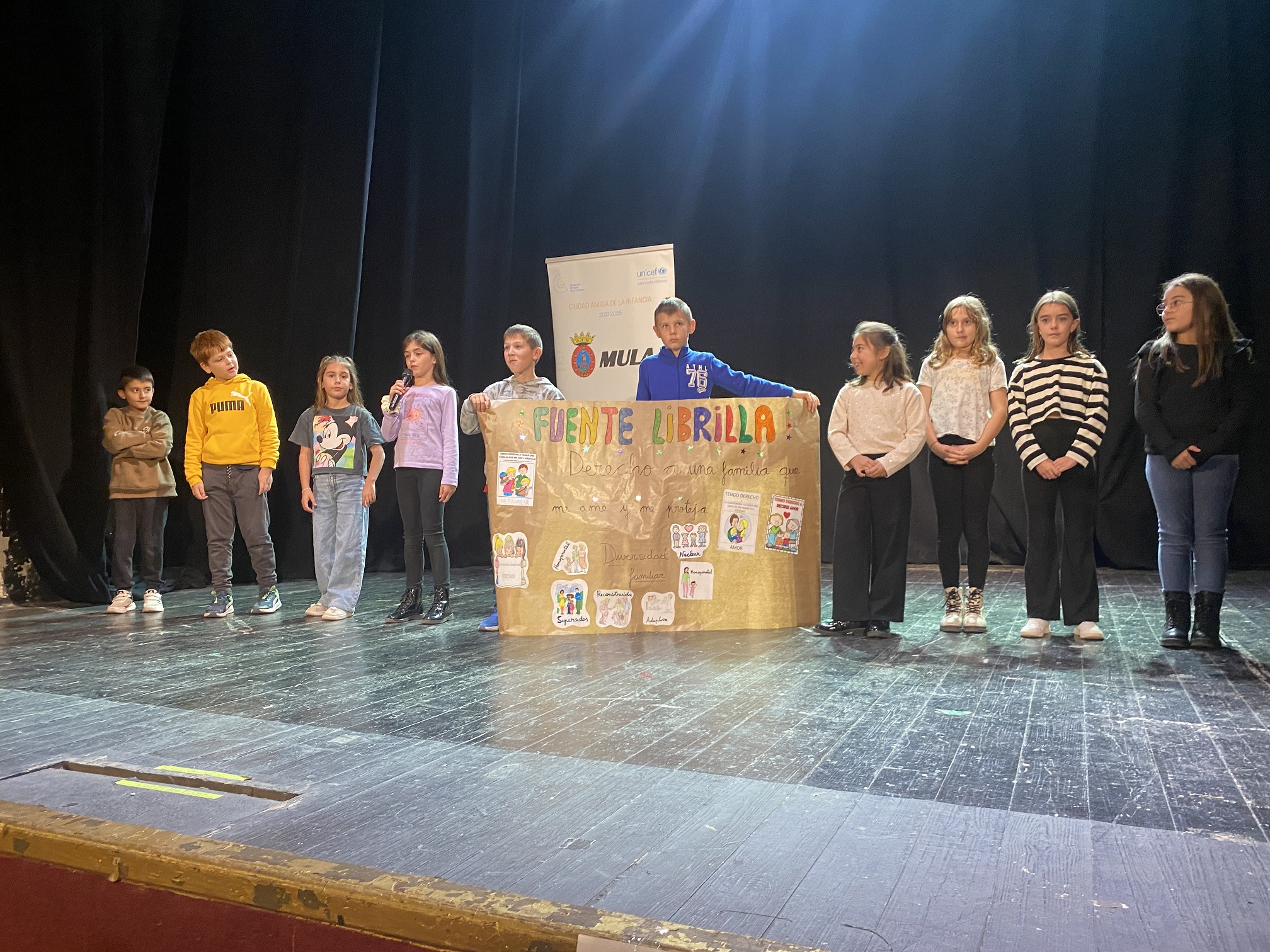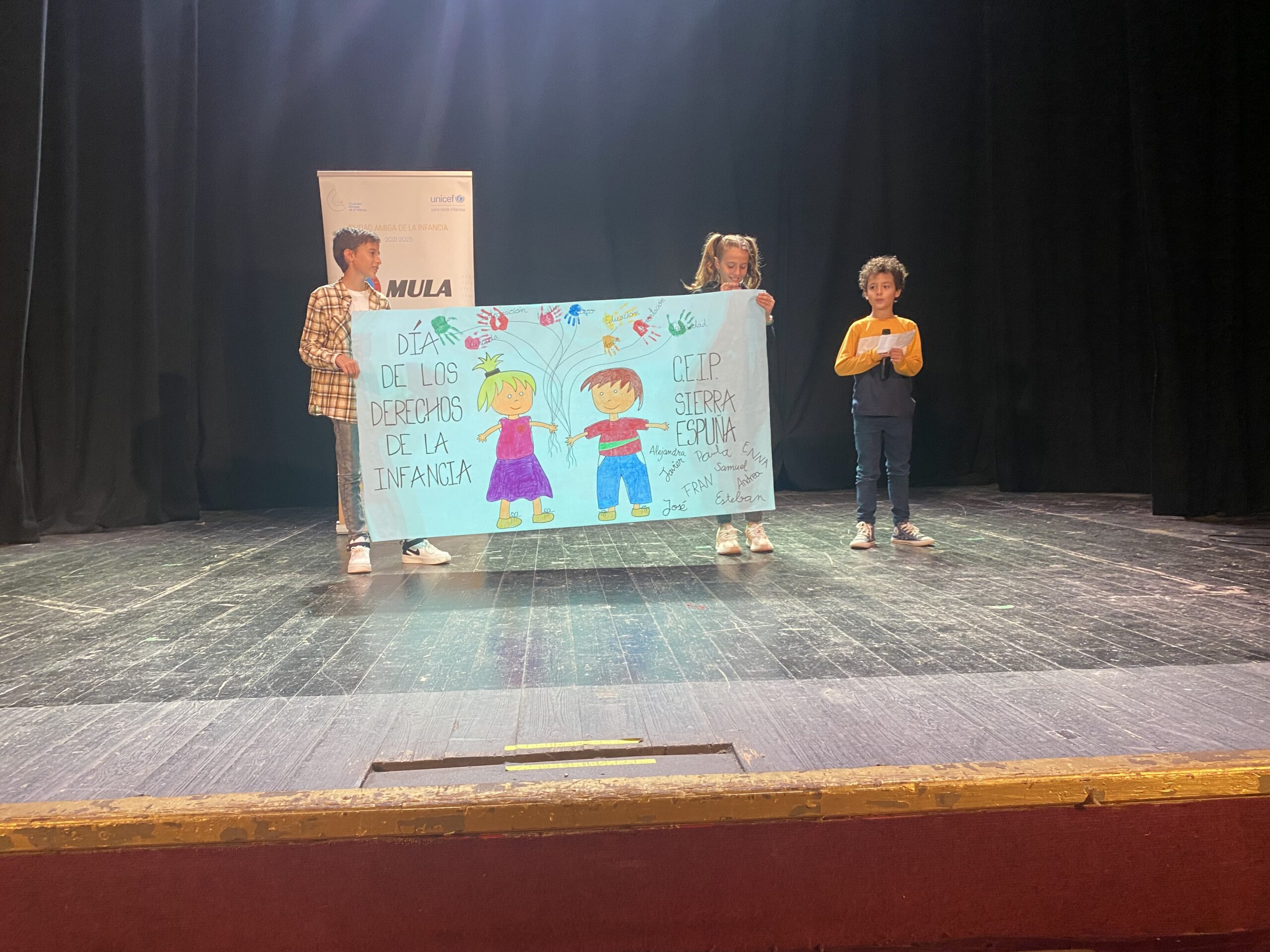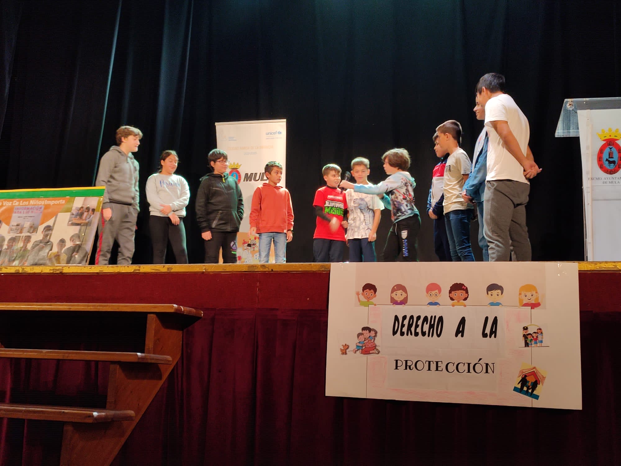 Durante la celebración, los colegios e institutos de Mula y pedanías han subido al escenario, y han mostrado los derecho de los niños, niñas y adolescentes. Además, se han comprometido a cumplirlo con acciones en sus propios centros escolares. El CEIP Sierra Espuña de Casas Nuevas ha representado el derecho a la igualdad; el CEIP Nuestra Señora del Rosario de Fuente Librilla, el derecho a la familia; el CEIP la Purísima de Yéchar, el derecho a la participación; el CEIP Ortega y Rubio de la Puebla de Mula, el derecho a la salud; el CEIP Anita Arnao, el derecho a la protección contra los abusos y la violencia; el CEIP Florentino Bayona, el derecho a un medio ambiente saludable; el colegio Santa Clara, el derecho al juego; el colegio Cristo Crucificado, el derecho a la protección contra el trabajo perjudicial; el IES Ribera de los Molinos, el derecho a la protección en caso de guerra o desastre; el IES Ortega y Rubio, el derecho a la discapacidad.