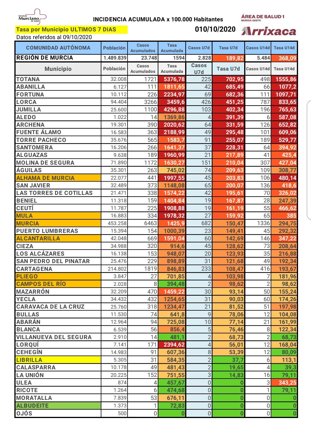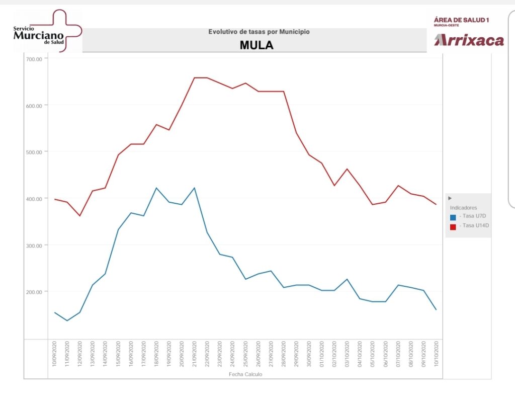 Desciende en el municipio de Mula el número de casos en los últimos 7 días, que actualmente es es de 27 casos, con una incidencia acumulada por cada 100.000 habitantes de 159,92.