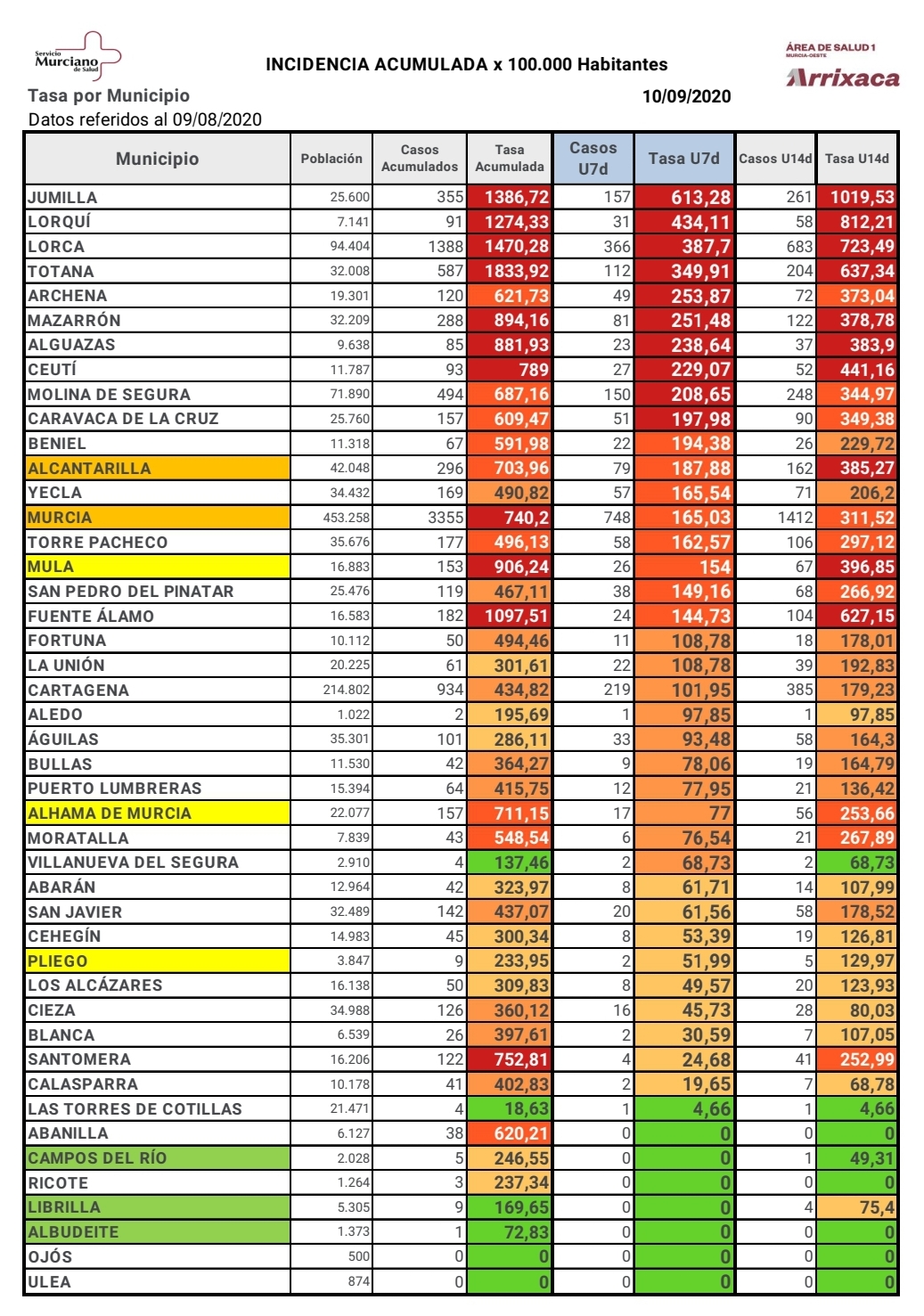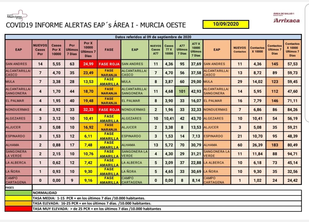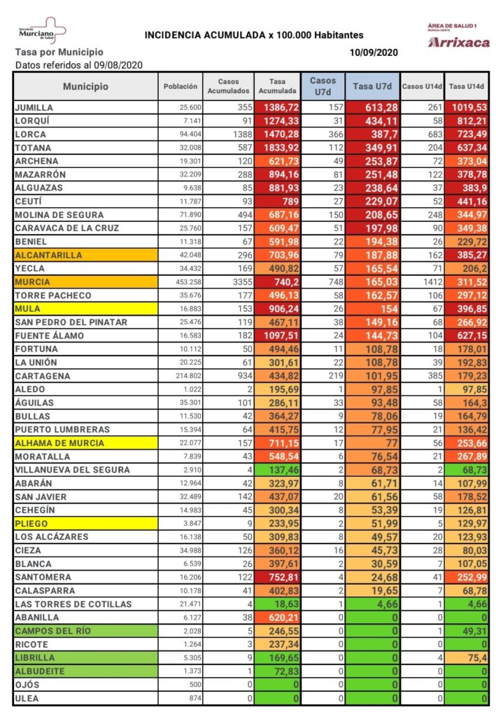 En el municipio de Mula continua estable el número de casos en los últimos 7 días, siendo actualmente 26 casos con una incidencia acumulada por cada 100.000 habitantes de 154.