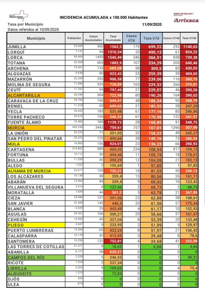En el municipio de Mula vuelven a descender el número de casos en los últimos 7 días, siendo actualmente 23 casos con una incidencia acumulada por cada 100.000 habitantes de 136,23.