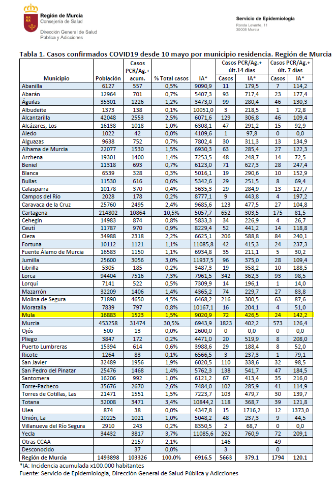 Los casos detectados en el municipio de Mula en los últimos 7 días siguen descendiendo hasta 24. La incidencia acumulada en los últimos 14 días es de 426,50 por cada 100.000 habitantes.