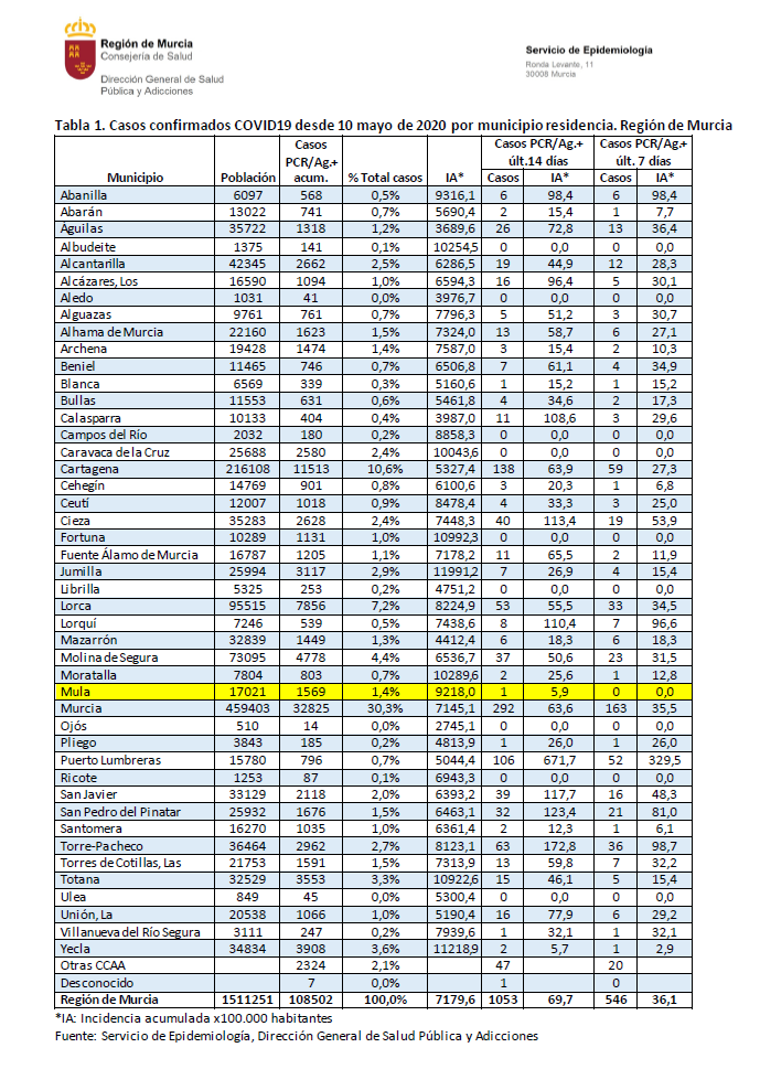 No hay ningún positivo por Covid-19 en el municipio de Mula en los últimos 7 días. La incidencia acumulada en los últimos 14 días es de 5,9 por cada 100.000 habitantes.