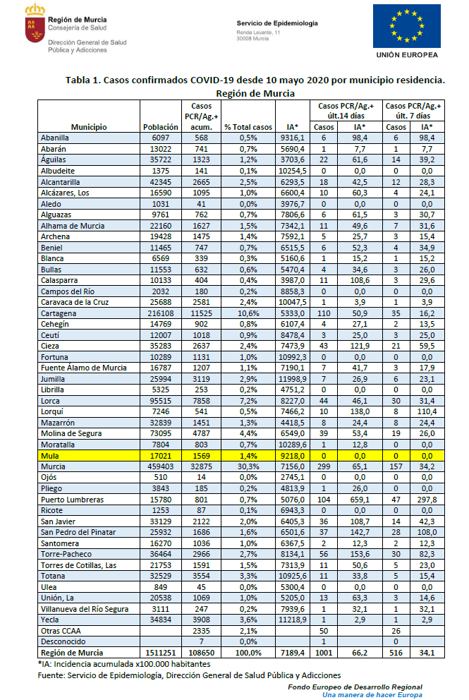 Seguimos sin ningún positivo por Covid-19 en el municipio de Mula en los últimos 14 días.