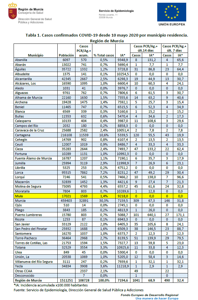 Seguimos sin ningún positivo por Covid-19 en el municipio de Mula en los últimos 14 días.