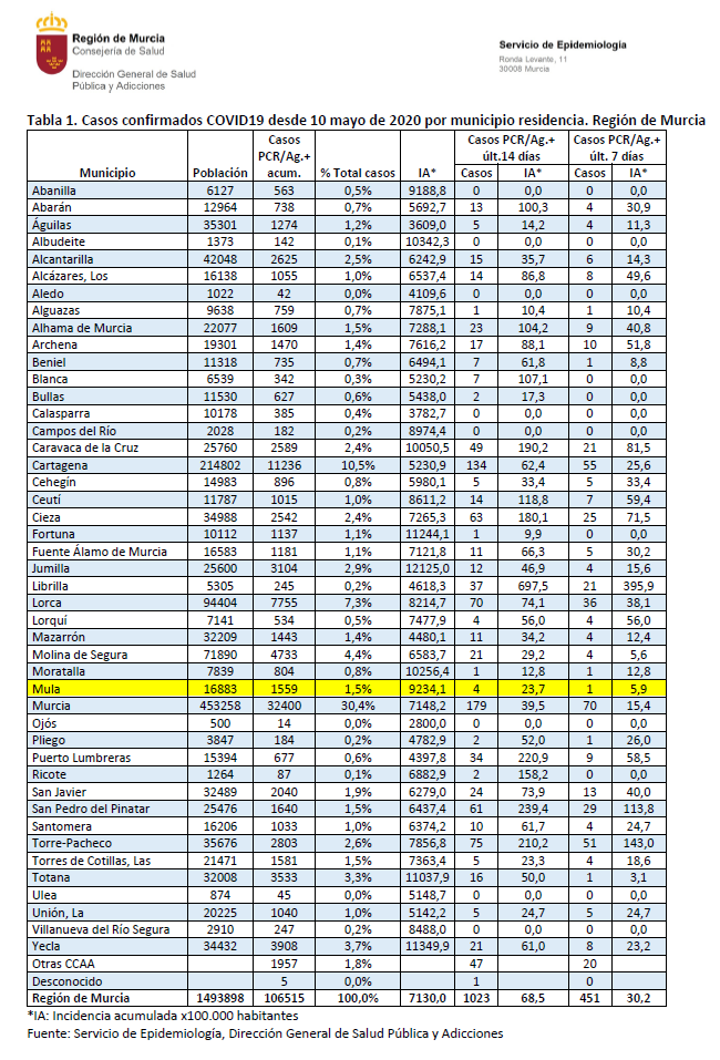 Sigue existiendo un caso confirmado de Covid-19 en el municipio de Mula en los últimos 7 días. La incidencia acumulada en los últimos 14 días está por debajo de 25, siendo de 23,7 por cada 100.000 habitantes.