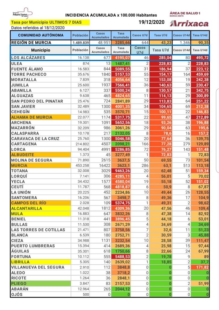 Se mantienen en 8 los casos detectados en el municipio de Mula en los últimos 7 días. La incidencia acumulada en los últimos 14 días es de 82,92 por cada 100.000 habitantes.