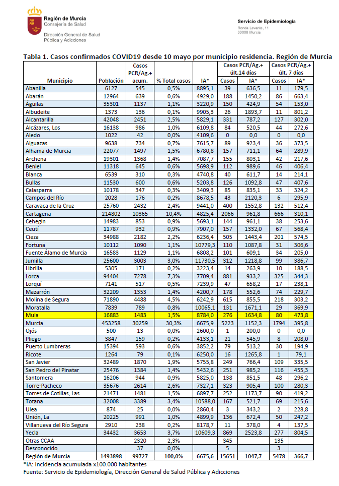 Los casos detectados en el municipio de Mula en los últimos 7 días descienden hasta 80. La incidencia acumulada en los últimos 14 días es de 1634,80 por cada 100.000 habitantes.