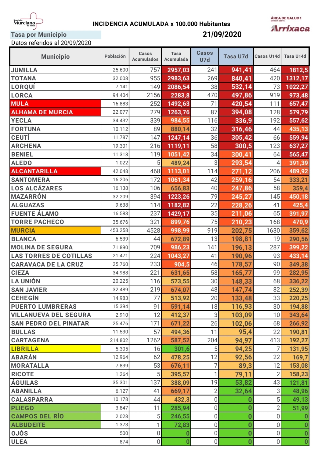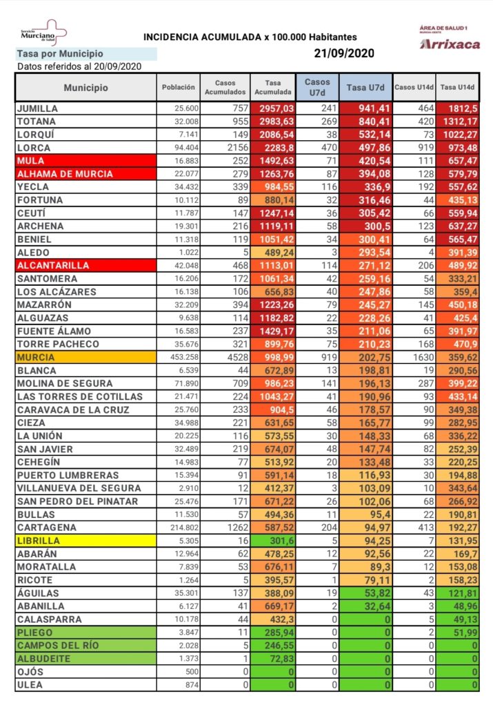 En el municipio de Mula asciende el número de casos en los últimos 7 días, siendo actualmente 71 casos con una incidencia acumulada por cada 100.000 habitantes de 420,54.