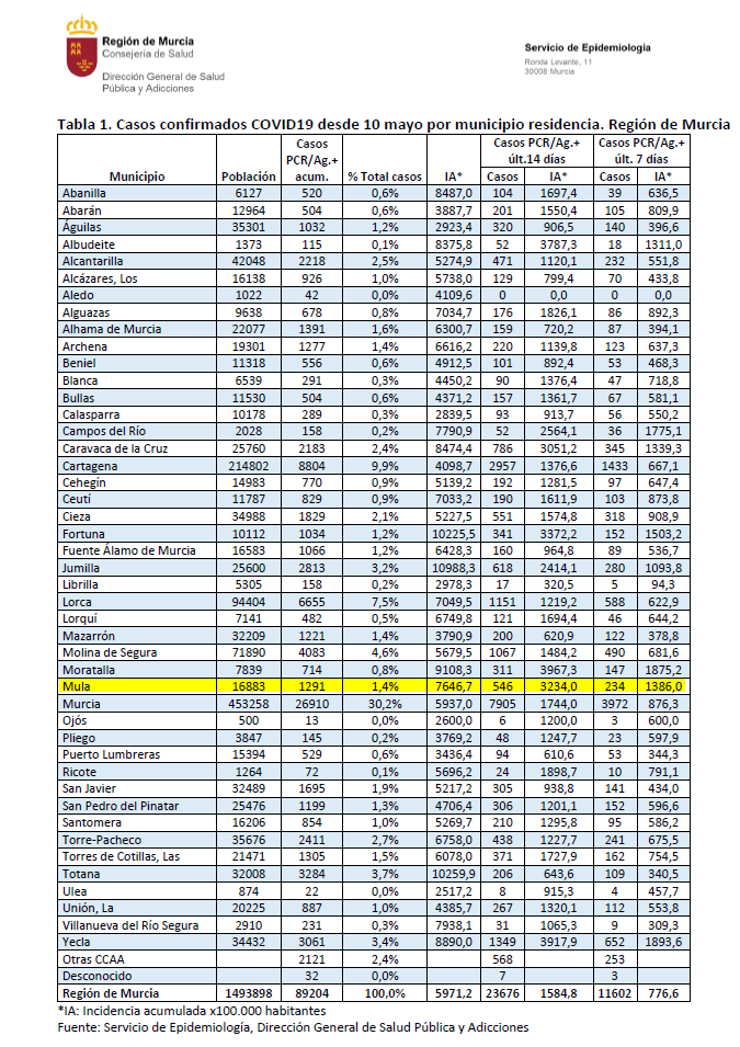 Los casos detectados en el municipio de Mula en los últimos 7 días descienden ligeramente hasta 234, pero la cifra siendo muy muy elevada. La incidencia acumulada en los últimos 14 días es de 3234,00 por cada 100.000 habitantes cuando para salir del nivel de transmisión extrema debe estar por debajo de 500,00.