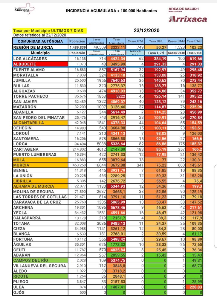 Los casos detectados en el municipio de Mula en los últimos 7 días descienden ligeramente hasta 13. La incidencia acumulada en los últimos 14 días es de 130,31 por cada 100.000 habitantes.