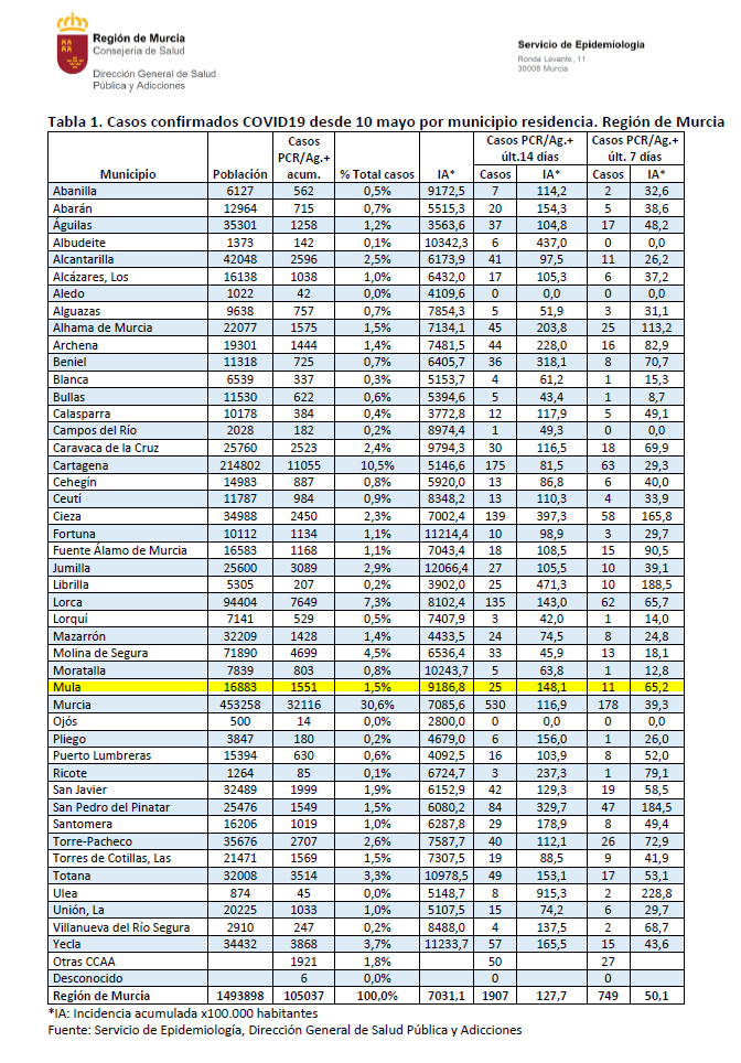 Los casos detectados en el municipio de Mula en los últimos 7 días ascienden a 11. La incidencia acumulada en los últimos 14 días es de 148,10 por cada 100.000 habitantes.