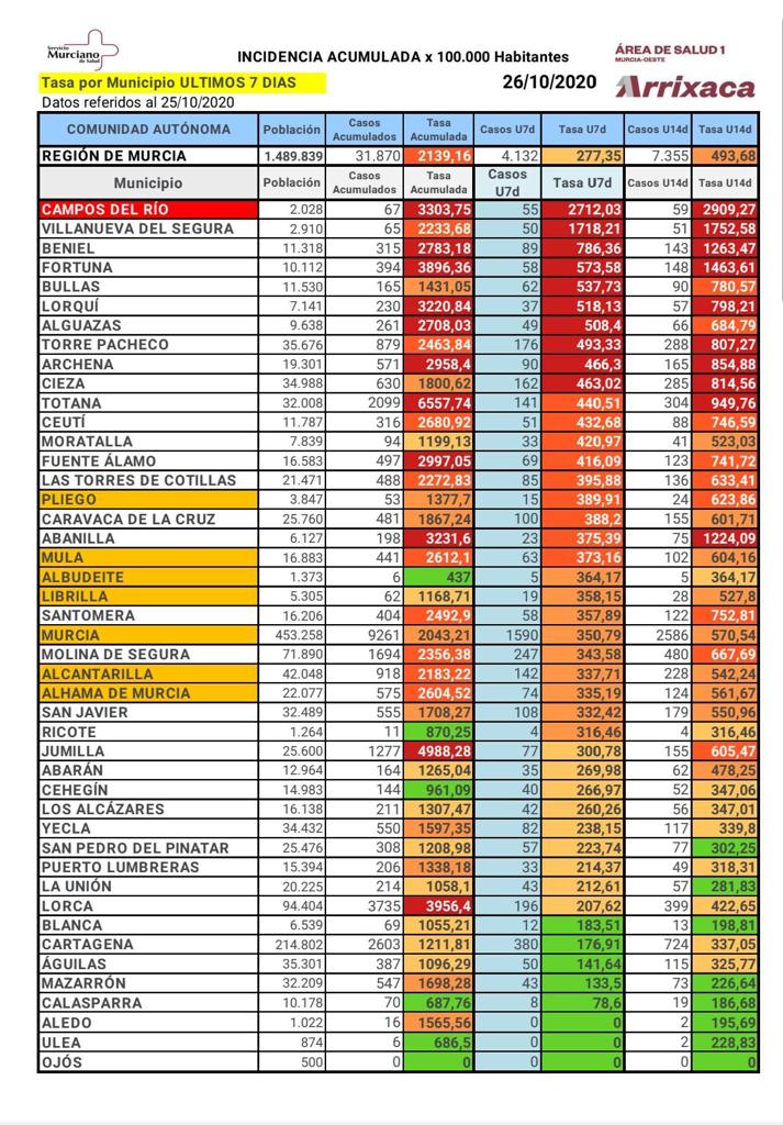 Desciende en el municipio de Mula el número de casos en los últimos 7 días, que actualmente es de 63 casos, 4 menos que ayer, con una incidencia acumulada por cada 100.000 habitantes de 373,16.