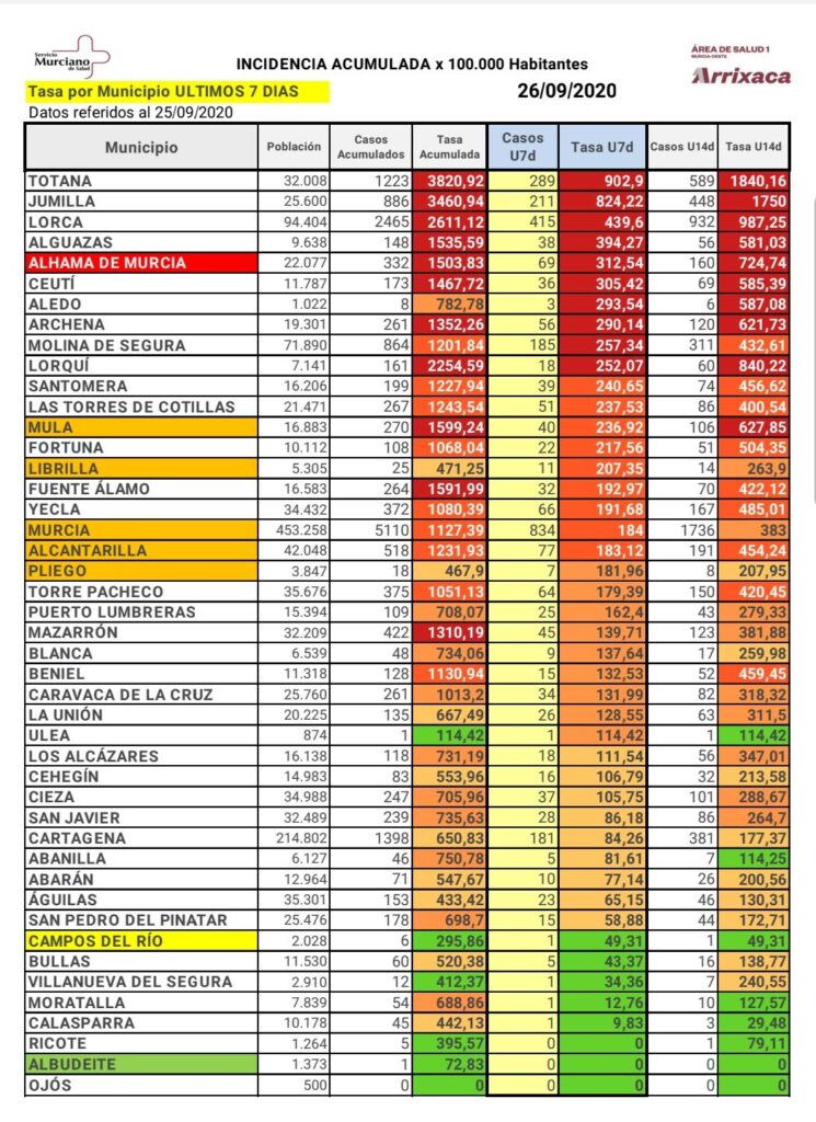 View Larger Image SANIDAD | Actualización de datos a fecha de 26 de septiembre de 2020 del Centro de Salud en relación al COVID-19 En el municipio de Mula el número de casos en los últimos 7 días es de 40 casos, con una incidencia acumulada por cada 100.000 habitantes de 236,92. El Centro de Salud sigue en nivel naranja. Comparte esto: Comparte en Facebook (Se abre en una ventana nueva) Facebook Compartir en X (Se abre en una ventana nueva) X Compartir en Telegram (Se abre en una ventana nueva) Telegram Compartir en WhatsApp (Se abre en una ventana nueva) WhatsApp Imprimir (Se abre en una ventana nueva) Imprimir admin2021-05-12T20:08:15+02:00sábado, 26 septiembre 2020|coronavirus, sanidad|
