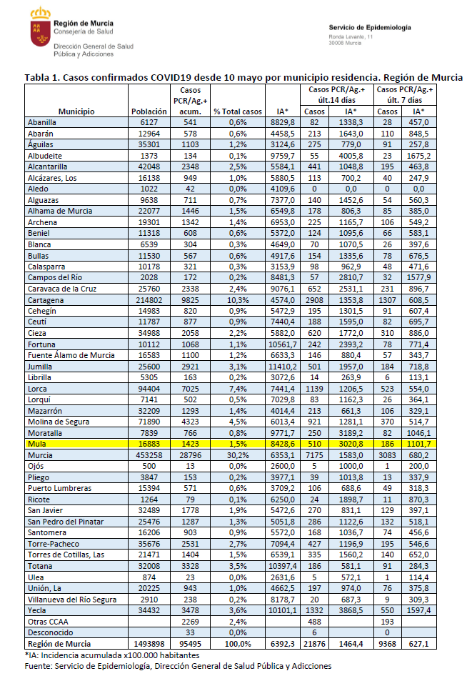 Los casos detectados en el municipio de Mula en los últimos 7 días descienden ligeramente hasta 186, pero la cifra siendo muy muy elevada. La incidencia acumulada en los últimos 14 días es de 3020,80 por cada 100.000 habitantes cuando para salir del nivel de transmisión extrema debe estar por debajo de 500,00.