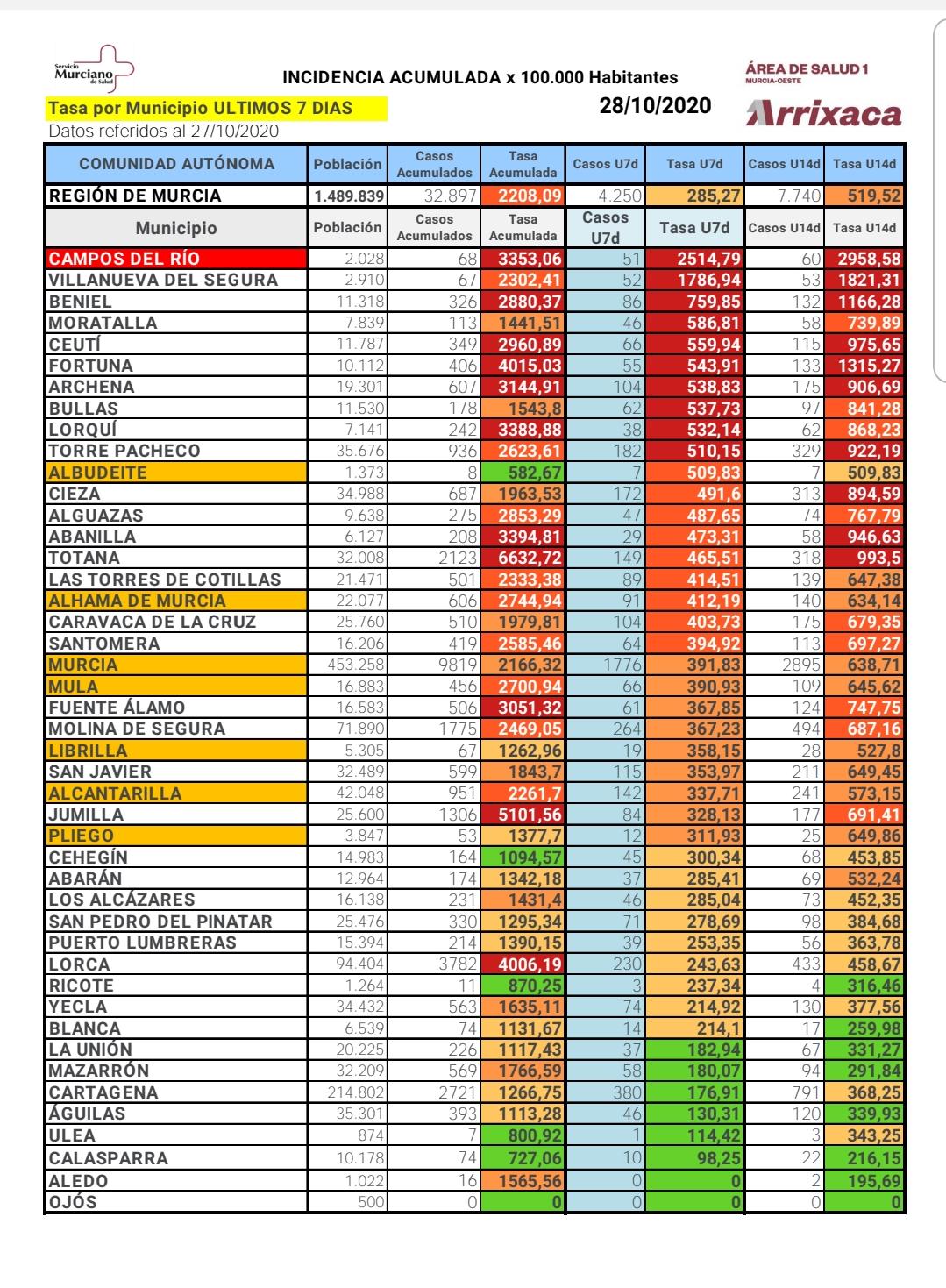 Desciende en el municipio de Mula el número de casos en los últimos 7 días, que actualmente es de 66 casos, 2 menos que ayer, con una incidencia acumulada por cada 100.000 habitantes de 390,93.
