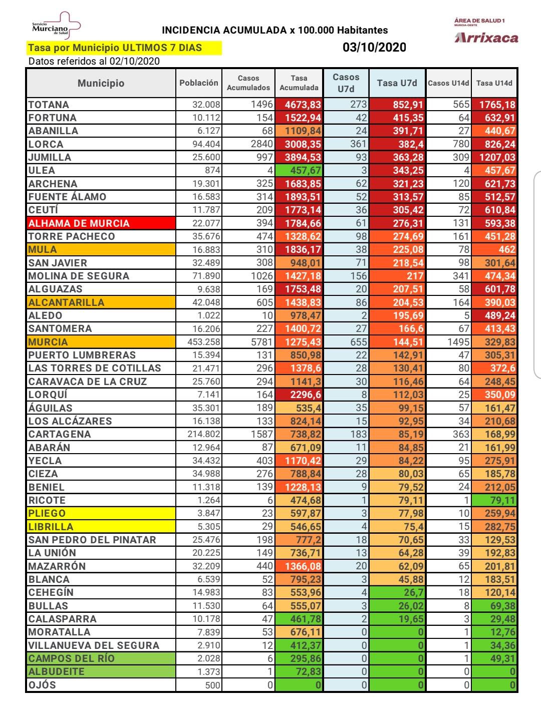 Se estabiliza en el municipio de Mula el número de casos en los últimos 7 días, que actualmente es es de 38 casos, con una incidencia acumulada por cada 100.000 habitantes de 225,08.