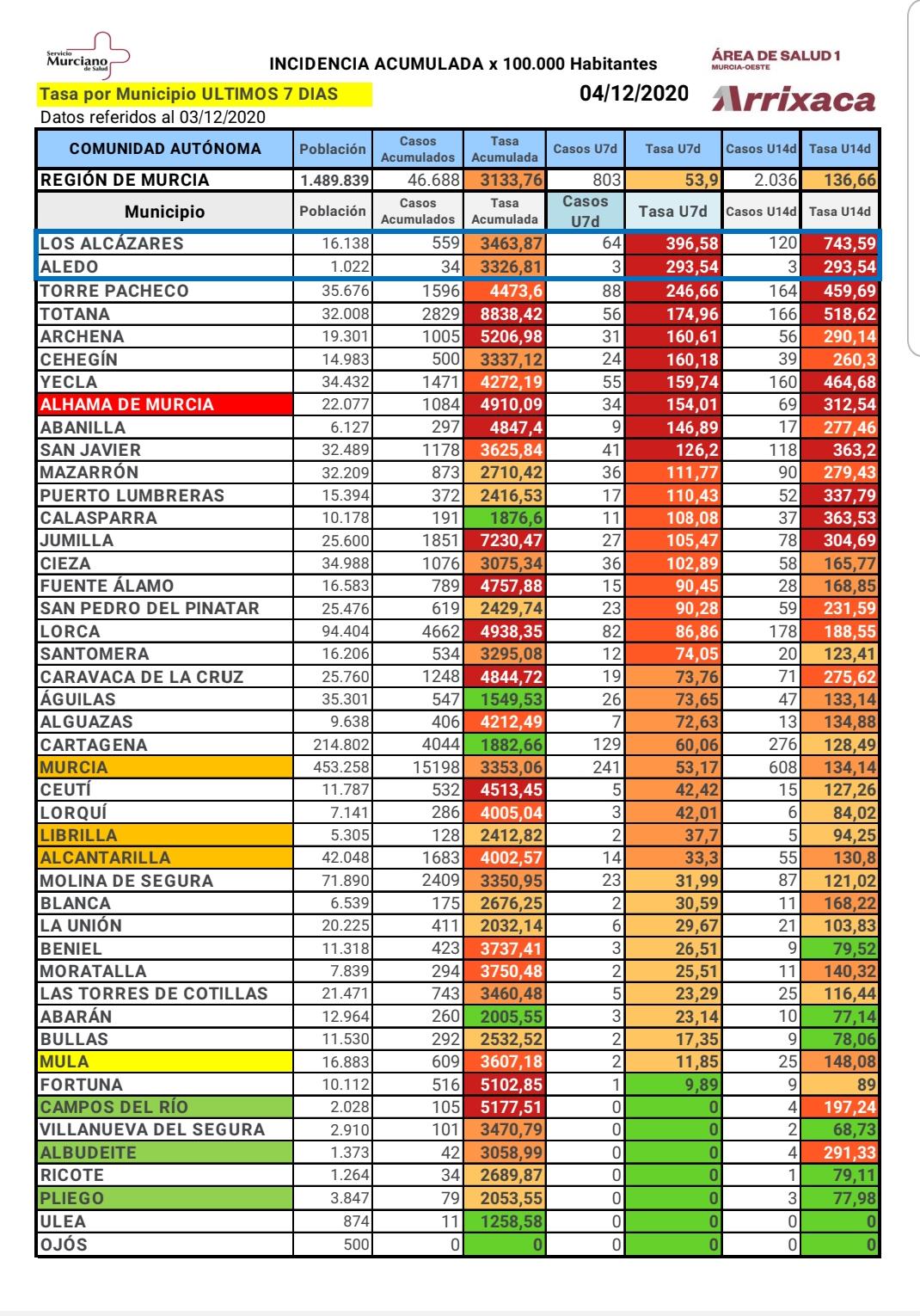 Descienden el número de casos en los últimos 7 días en el municipio de Mula, que actualmente es de 2 casos, con una incidencia acumulada por cada 100.000 habitantes de 11,85
