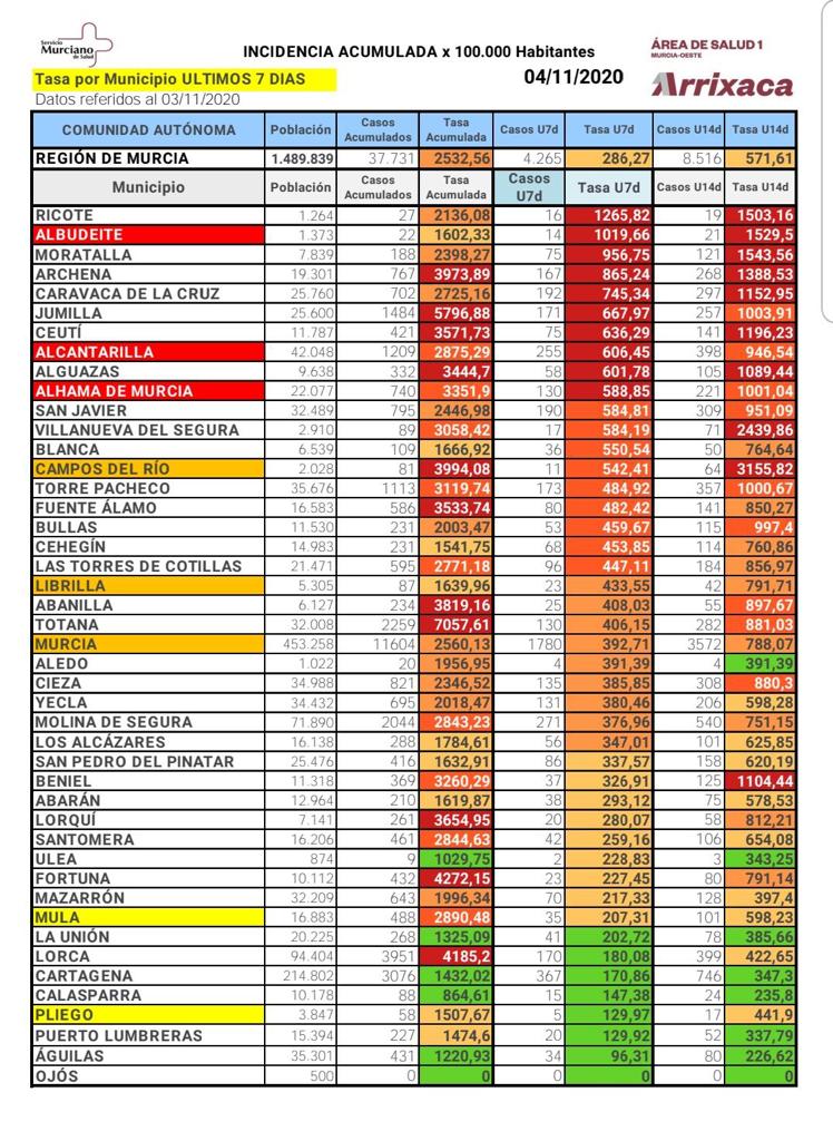 Aumentan en el municipio de Mula el número de casos en los últimos 7 días, que actualmente es de 35 casos, 2 más que ayer, con una incidencia acumulada por cada 100.000 habitantes de 207,31