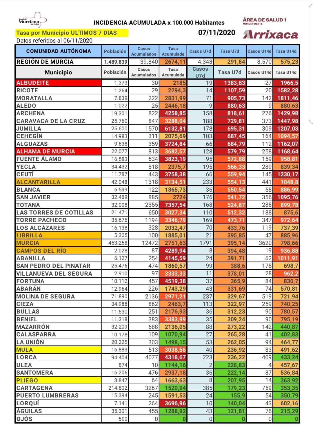 Aumenta en 4 personas el número de casos en los últimos 7 días del municipio de Mula, que actualmente es de 40 casos, con una incidencia acumulada por cada 100.000 habitantes de 236,92