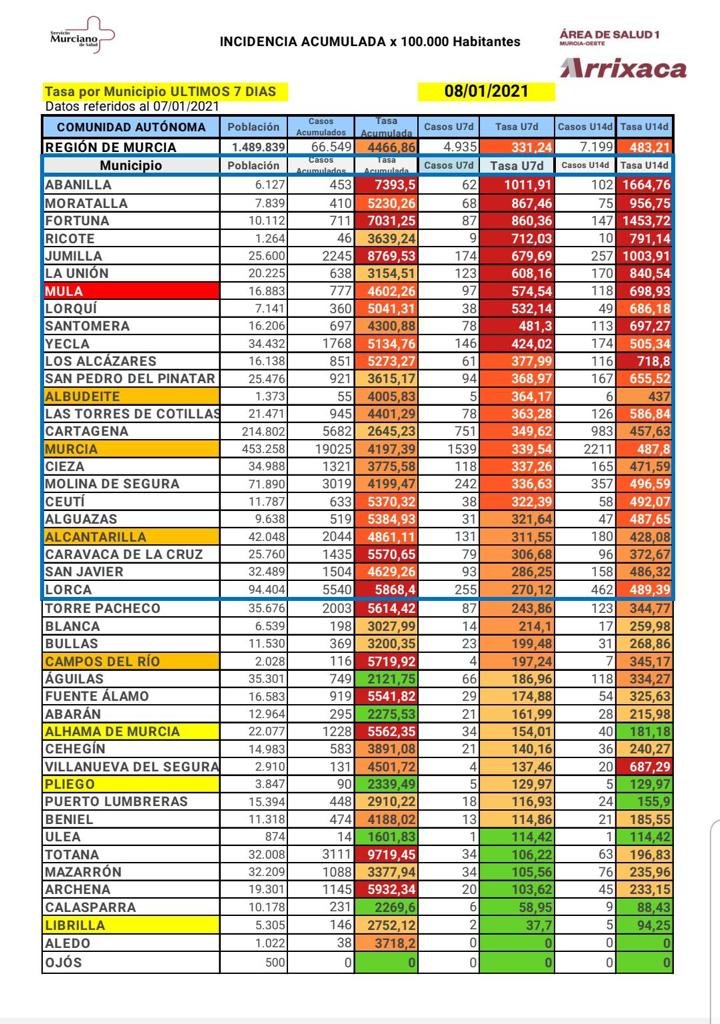 Los casos detectados en el municipio de Mula en los últimos 7 días siguen ascendiendo fuertemente y llegan hasta 97. La incidencia acumulada en los últimos 14 días es de 698,93 por cada 100.000 habitantes.