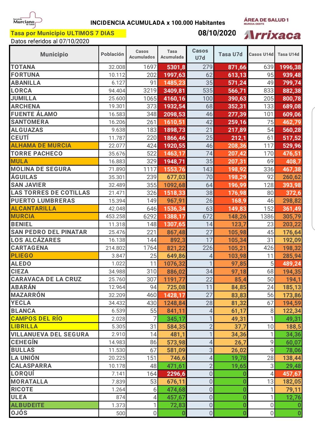 Desciende levemente en el municipio de Mula el número de casos en los últimos 7 días, que actualmente es es de 35 casos, con una incidencia acumulada por cada 100.000 habitantes de 207,31.
