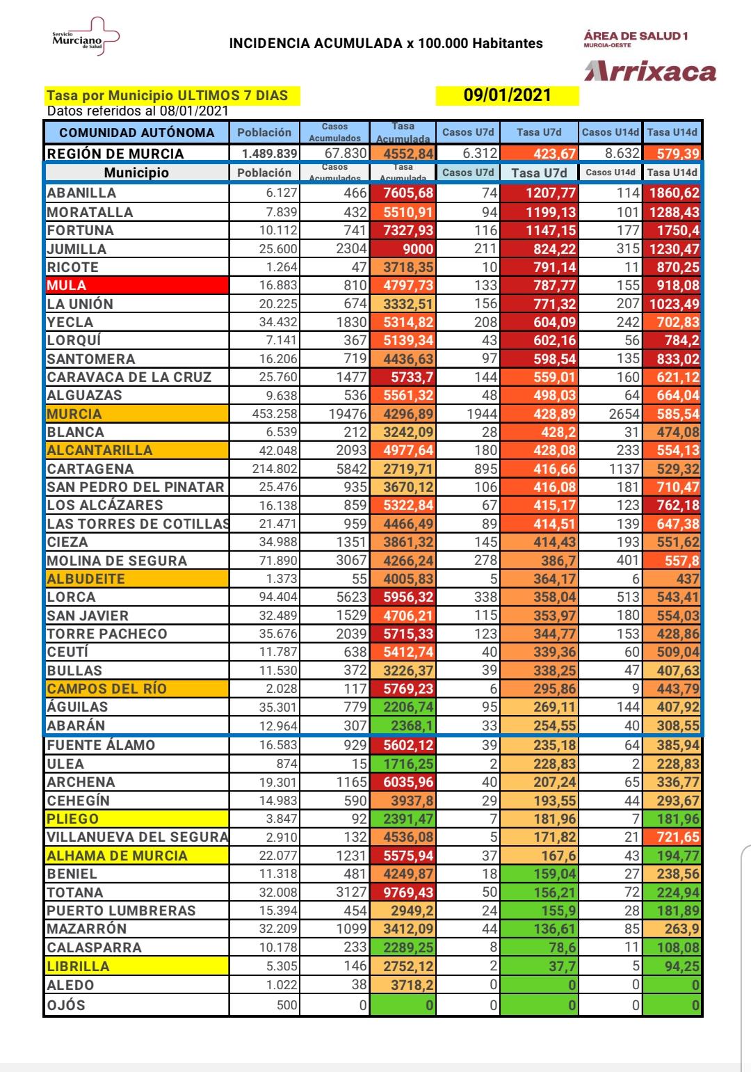 Los casos detectados en el municipio de Mula en los últimos 7 días siguen ascendiendo fuertemente y llegan hasta 133. La incidencia acumulada en los últimos 14 días es de 918,08 por cada 100.000 habitantes.