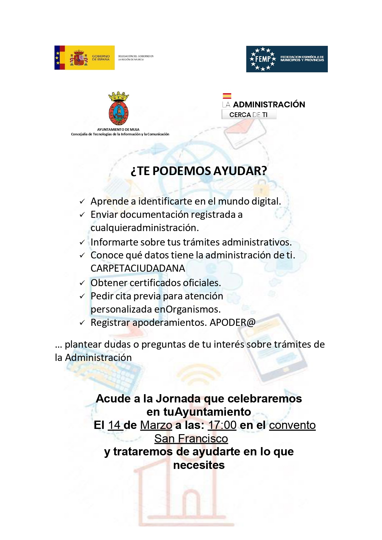 En la jornada, dirigida a cualquier ciudadano de Mula y pedanías, podrás conocer aspectos como: identificarte en el mundo digital, enviar documentación registrada a cualquier administración, informarte sobre tus trámites administrativos, conoce qué datos tiene la administración de ti -Carpeta Ciudadana-, obtener certificados oficiales, pedir cita previa para atención personalizada en organismos, registrar apoderamientos -APODER@-, plantear dudas o preguntas de tu interés sobre trámites de la Administración.