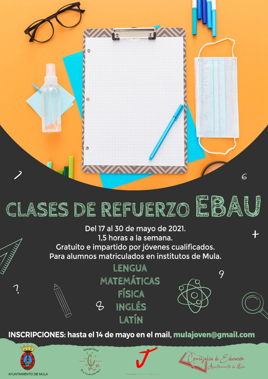 Las clases serán gratuitas impartidas por jóvenes cualificados y van destinadas a reforzar conocimientos y resolver dudas para aquellos alumnos matriculados en los institutos de Mula y que este año se presenten a la EBAU.