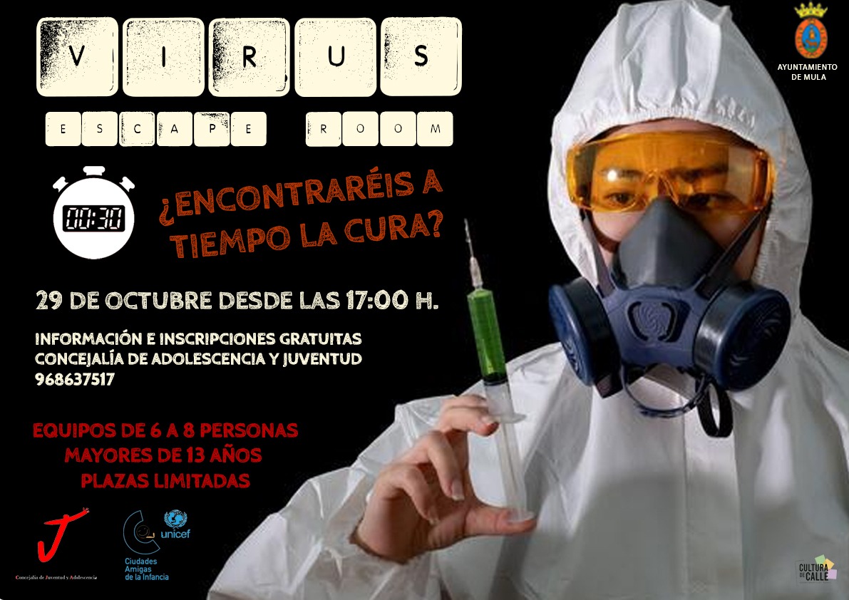 Para los jóvenes a partir de 13 años se ha organizado un Escape Room Virus que contará con equipos de 6 a 8 participantes que deberán disputar terroríficas y divertidas pruebas para conseguir el antídoto que les libre del virus Será a partir de las 17.00 horas y se necesita previa inscripción en el Espacio M de lunes a viernes de 8 a 15 horas.