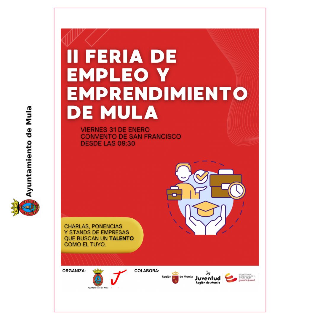 La concejalía de Juventud del Ayuntamiento de Mula organiza el próximo viernes 31 de enero la II Feria de Empleo y Emprendimiento, contando con la colaboración de la Dirección General de Juventud de la Región de Murcia. Este evento tendrá lugar en el Convento de San Francisco, desde las 09:30 horas, y busca ser un punto de encuentro clave para el desarrollo profesional y emprendedor de los jóvenes de la comarca.