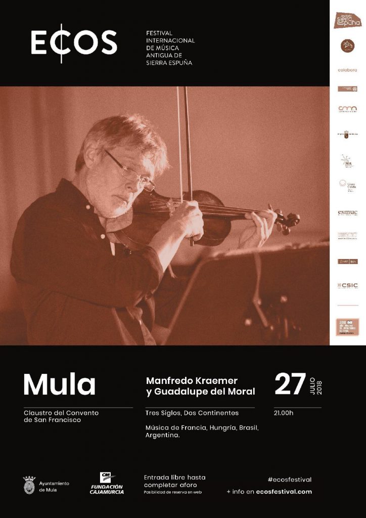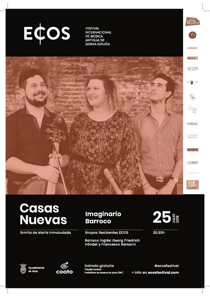 El festival ECOS, en su tercera edición y organizado por el Territorio Sierra Espuña y Early Music Project en colaboración con el Ayuntamiento de Mula, realizará tres conciertos en el municipio de Mula. El primer concierto, “Grupos Residentes ECOS ” tendrá lugar el próximo 25 de julio a las 20:30 h. en la ermita de la Inmaculada, en la pedanía muleña de Casas Nuevas. El segundo concierto en nuestro municipio “Quebrado Barroco” estará destinado a los niños, y tendrá lugar el jueves 26 a las 10.00h en el