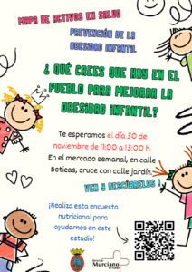 El próximo sábado 30 de noviembre, a partir de las 11:00 h, se instalará un stand de salud en el Mercado Semanal, ubicado en la Calle Boticas, para recopilar información directamente de los vecinos del municipio. A través de esta acción, se busca conocer sus percepciones y conocimientos sobre hábitos saludables y su relación con la prevención de la obesidad infantil.