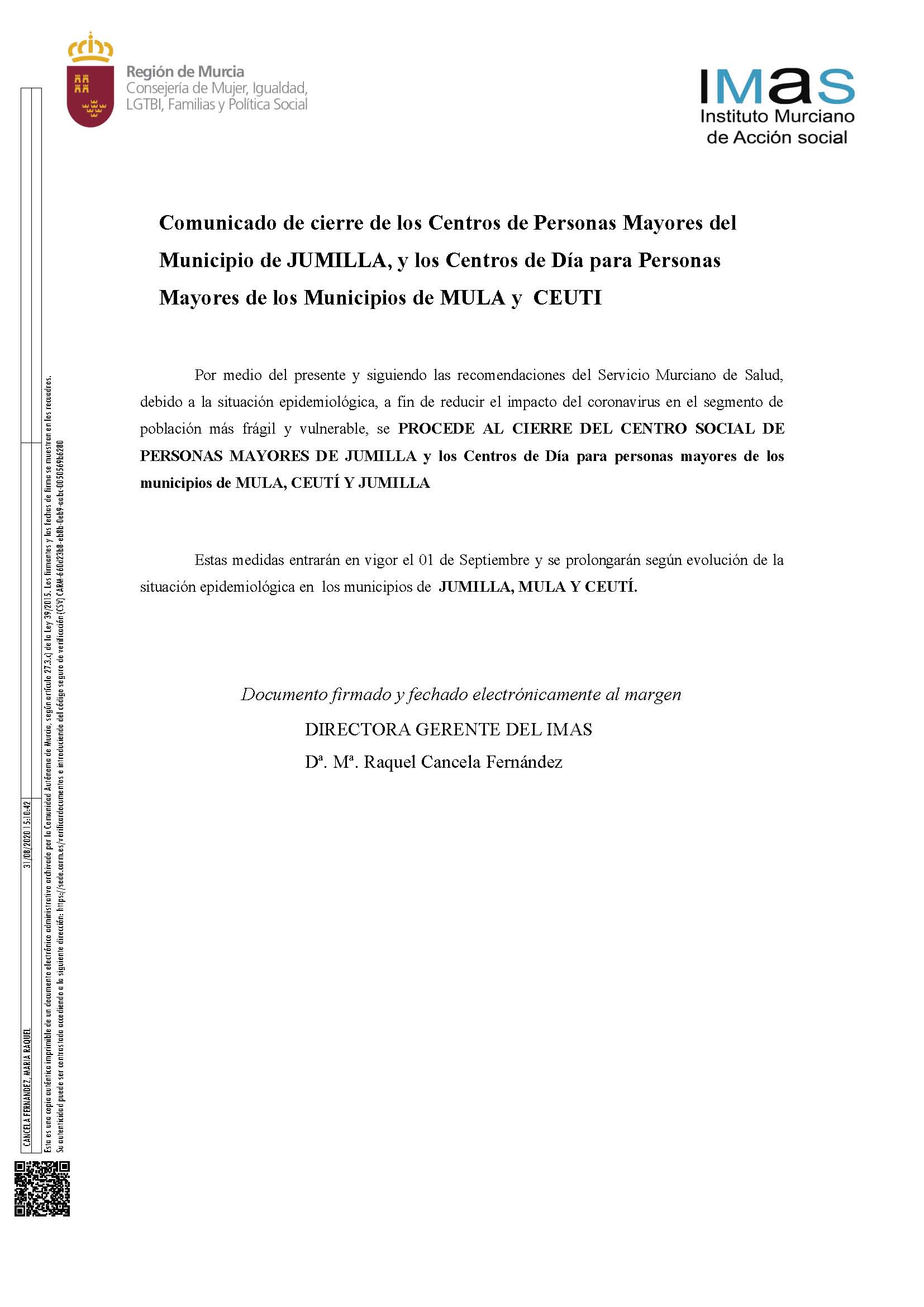 View Larger Image MAYORES | Comunicado de cierre de los Centros de día para personas mayores del municipio de Mula Comunicado oficial cierre del Centro de día de Mula (.pdf) Comparte esto: Comparte en Facebook (Se abre en una ventana nueva) Facebook Compartir en X (Se abre en una ventana nueva) X Compartir en Telegram (Se abre en una ventana nueva) Telegram Compartir en WhatsApp (Se abre en una ventana nueva) WhatsApp Imprimir (Se abre en una ventana nueva) Imprimir Rosario Martínez2021-05-12T20:08:39+02:00martes, 1 septiembre 2020|mayores|