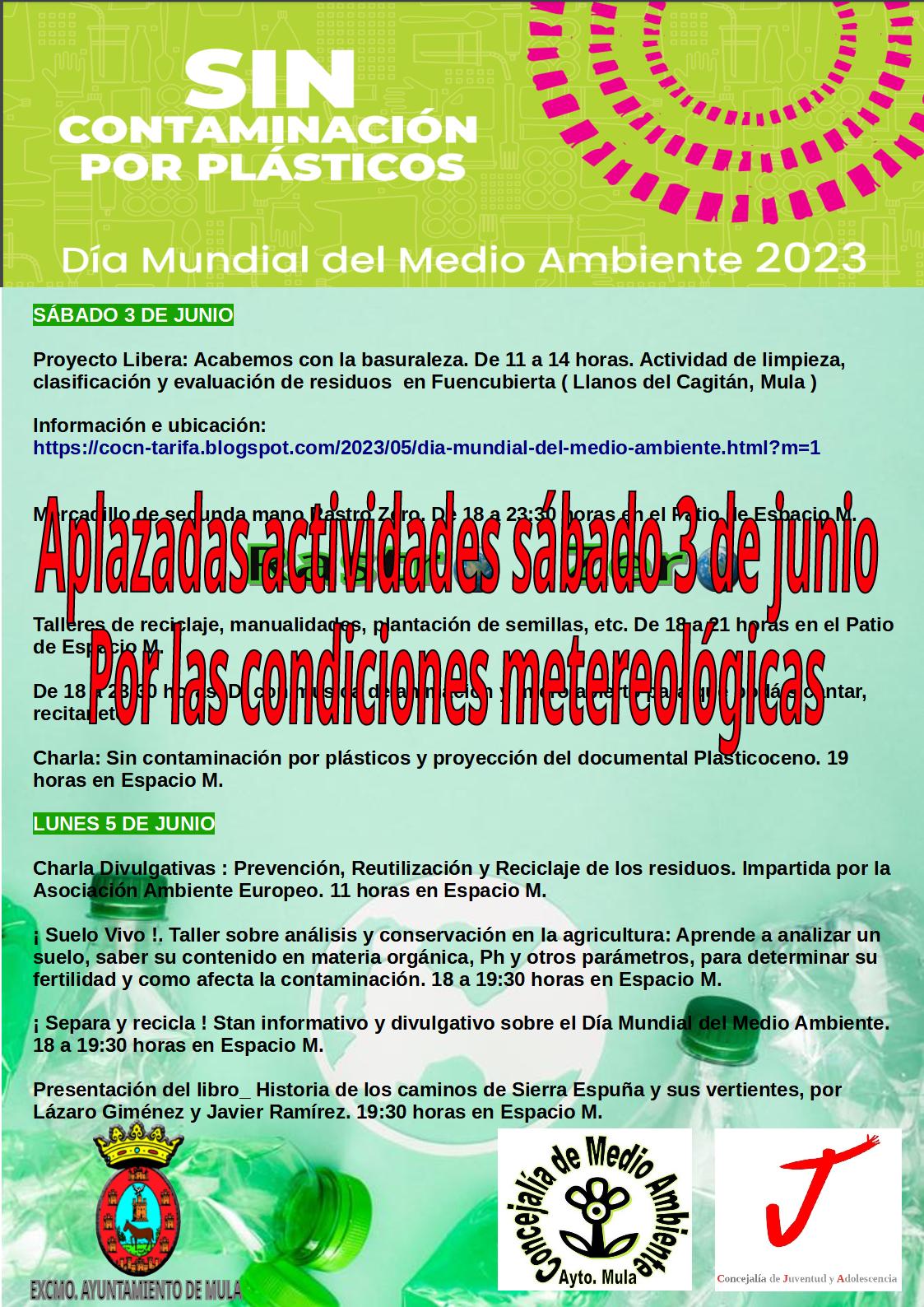 Debido a las condiciones meteorológicas adversas previstas se ha decidido aplazar las actividades previstas para el sábado, 3 de junio, con motivo del Día Mundial del Medio Ambiente. La nueva fecha de realización está todavía pendiente de determinación.