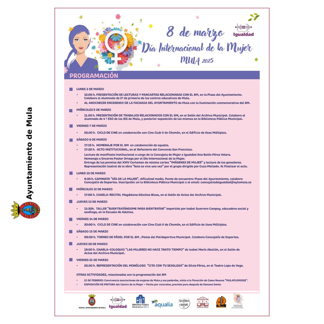 El programa de actividades arrancará el 3 de marzo con actividades realizadas por los centros educativos en la Plaza del Ayuntamiento, y el encendido conmemorativo de la fachada del Ayuntamiento. Además, el acto central del 8M, que incluirá la entrega de premios del XXIV Certamen de Relatos Cortos «Imágenes de Mujer», concluirá con la representación de la obra «Solo se vive una vez», dirigida por Cuca Mellado.