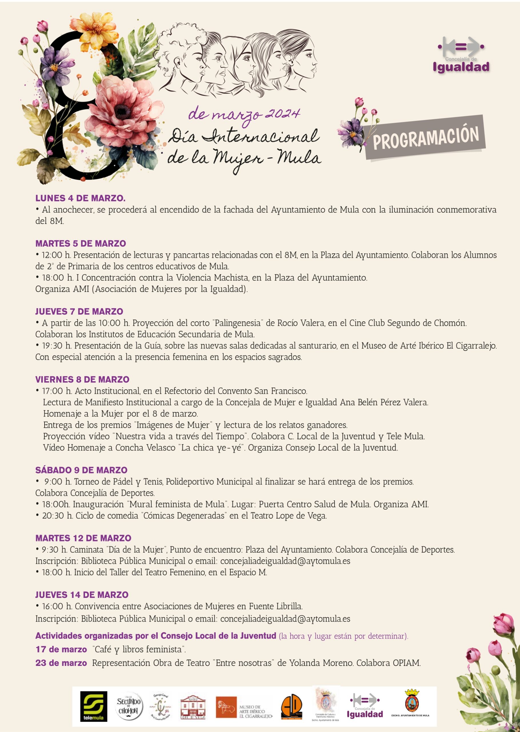 La programación acoge la I Concentración contra la Violencia Machista, organizada por la Asociación de Mujeres por la Igualdad, el 5 de marzo, en la plaza del Ayuntamiento; y la lectura de manifiestos por el 8M, por parte de los alumnos de Primaria de los centros educativos de Mula. Y en ella predominan actos de carácter cultural, como la presentación de la guía de las nuevas salas del Museo de Arte Ibérico El Cigarralejo, donde se pondrá el foco en la presencia femenina en los espacios sagrados; el Ciclo de Comedia Cómicas Degeneradas, en el Teatro Lope de Vega; o el taller de Teatro Femenino. También eventos como la Caminata Día de la Mujer, el Torneo de Pádel y Tenis o la Convivencia entre Asociaciones de Mujeres en Fuente Librilla, entre muchos más.