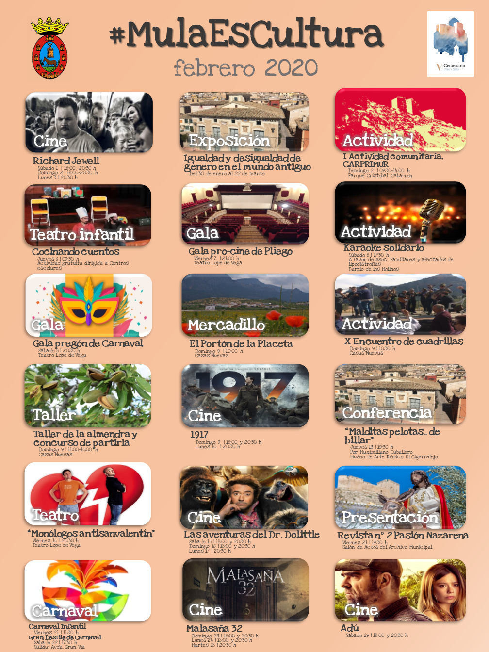 La Concejalía de Cultura y Patrimonio Histórico se complace en presentar el proyecto #MulaEsCultura, agenda mensual de actos de interés cultural en el Municipio de Mula y que hoy se ha estrenado oficialmente con la PROGRAMACIÓN FEBRERO 2020.