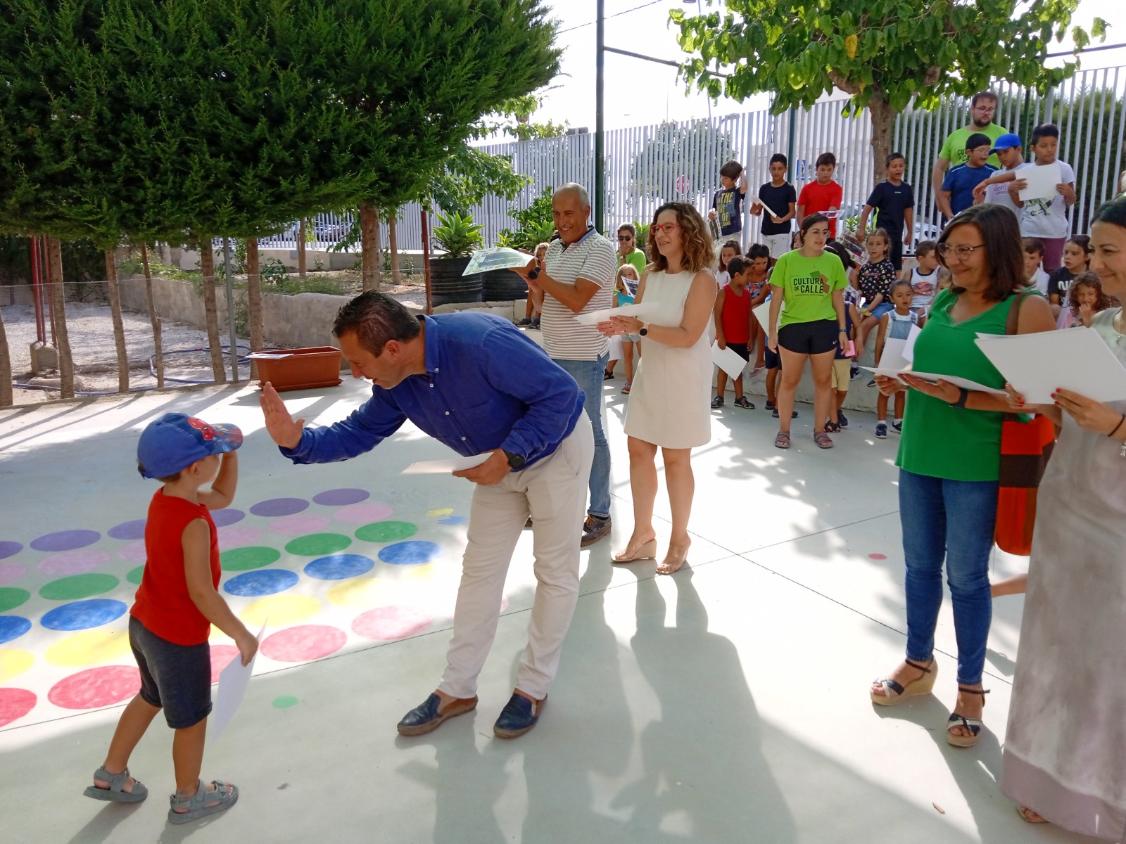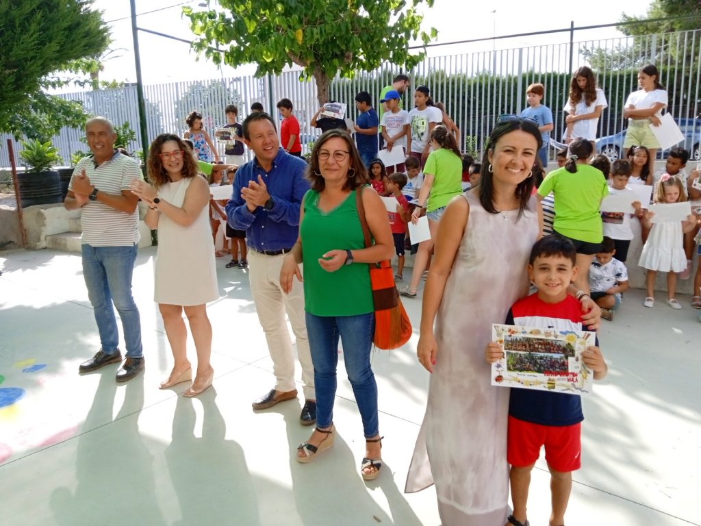 El alcalde de Mula, Juan Jesús Moreno, acompañado por los concejales Alejandra Martínez, Vicente López, Pilar Gil y Antonia Gabarrón, han participado en la entrega de diplomas a los niños participantes.