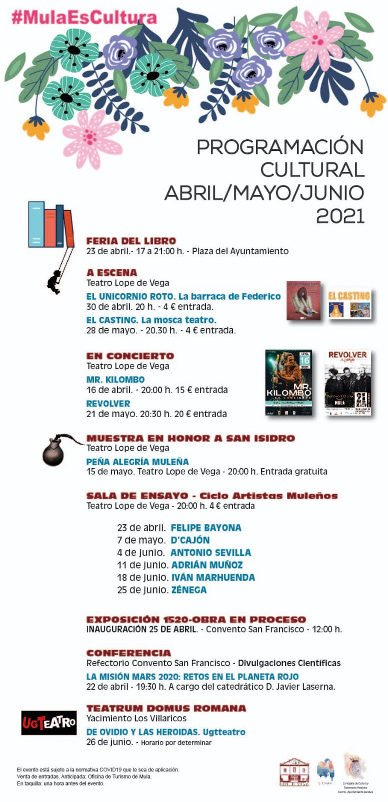 La programación se divide en cuatro bloques: A escena, dedicado al teatro; Sala de Ensayos, con conciertos monográficos de los artistas locales y que se prolongará durante el próximo verano; En concierto y un bloque variado donde se incluye la Feria del Libro el próximo 23 de abril en la plaza del Ayuntamiento con la participación de las librerías muleñas y actividades diversas, la inauguración de la exposición ‘1520 Obra en proceso’ dedicada al V Centenario del castillo el 25 de abril en el Convento San Francisco o la conferencia ‘La Misión Mars 2020. Retos en el planeta rojo’ a cargo del catedrático Javier Laserna el próximo 22 de abril en el Refectorio del Convento, así como una muestra en Honor a San Isidro a cargo de la Peña Alegría Muleña el 15 de mayo en el Teatro Lope de Vega.