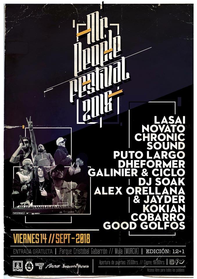 - 17:00 h. 12+1 Festival Mr. People. Desde las 5 de la tarde, actividades. A partir de las 9 de la noche, las actuaciones de LASAI, NOVATO, CHRONIC SOUND, PUTO LARGO, DHEFORMER, GALINIER & CICLO, DJ SOAK, ALEX ORELLANA & JAYDER, KOKIAN, COBARRO y GOOD GOLFOS. En el parque Cristóbal Gabarrón.