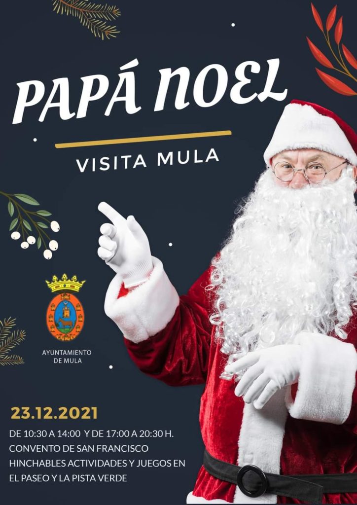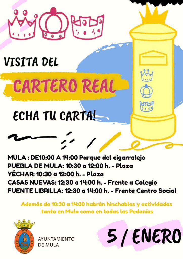 El miércoles 5 de enero visita de los pajes de SS.MM. los Reyes Magos a Mula y sus pedanías durante toda la mañana. En las pedanías y en la Pista Verde y Paseo de Mula, actividades y gimkana con juegos, hinchables y manualidades. Desde las 10.30 hasta las 14.00 horas.
