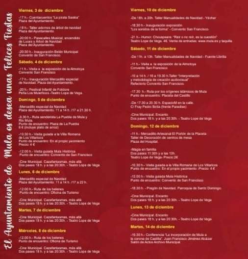 El sábado 4 de diciembre, a las 17.00 horas, inauguración del Mercadillo Especial de Navidad hasta el lunes 6 de diciembre en la plaza del Ayuntamiento. Por la tarde, a las 20.00 horas, Festival infantil de Folclore Peña Los Muleñicos en el Teatro Lope de Vega.