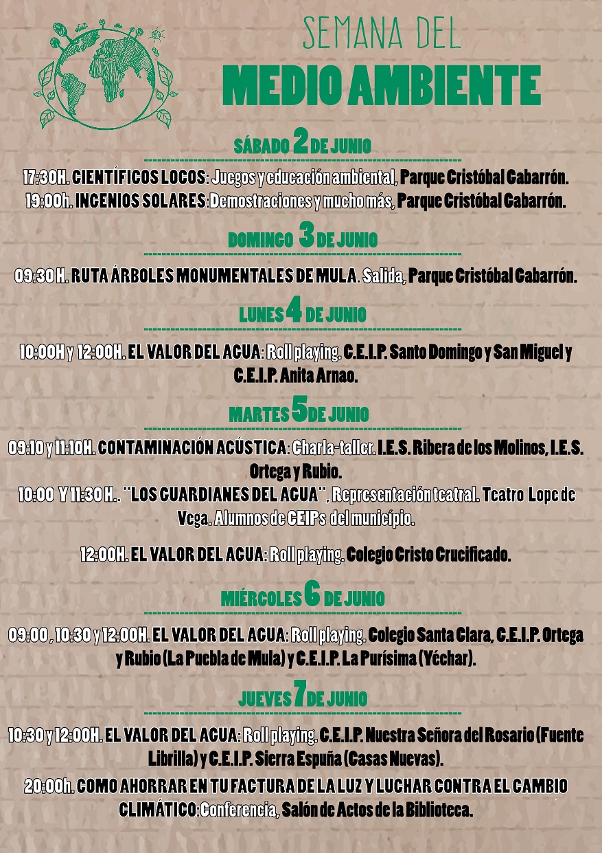 Las actividades se llevarán a cabo del 2 al 7 de junio y habrá actividades para todas las edades ya que este año se han aumentado las actividades dirigidas a los escolares incluyendo actividades en los colegios de pedanías y participando también en la representación teatral que se llevará a cabo en Mula, además de continuar llevando actividades a los centros educativos de Primaria y Secundaria de Mula.