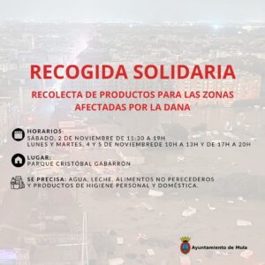 El Ayuntamiento de Mula, en colaboración con la FMRM, la Generalitat, la Diputación de Valencia y diversas ONGs, ha organizado una recogida de suministros esenciales para ayudar a los afectados por la devastadora DANA que tuvo lugar el pasado 29 de octubre, causando graves daños en diversos municipios. de la Región de Murcia y zonas vecinas.